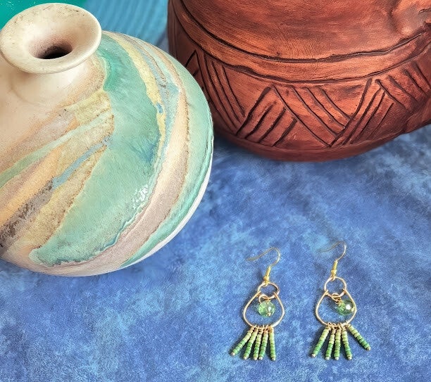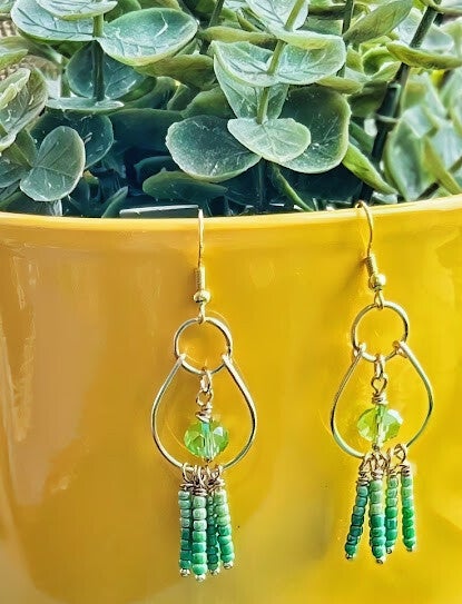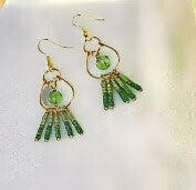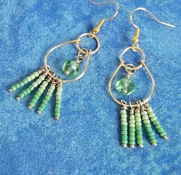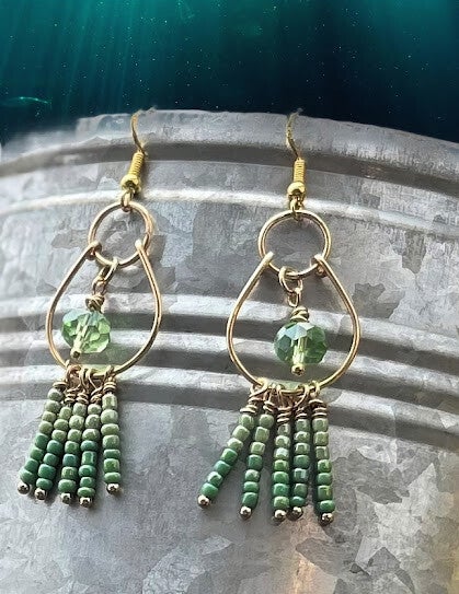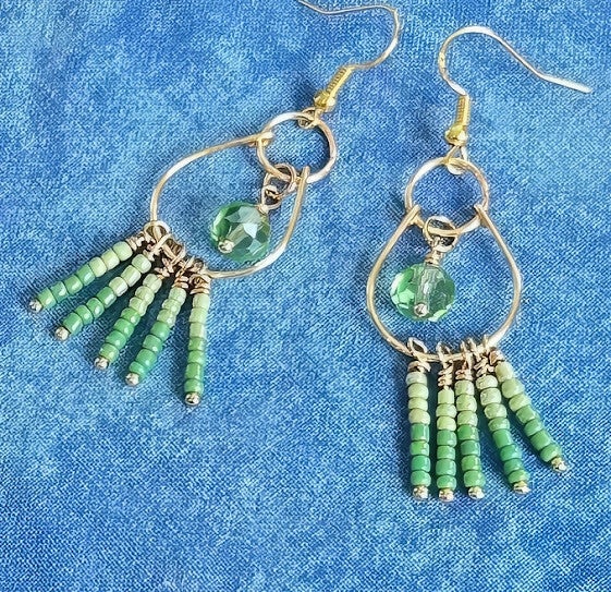 2.25" drop from the top of the 18 kt gold plated ear wire to the bottom of the, shades of green, ombre seed bead dangles. A central preciosa, green czech crystal, hangs within the frame. Hypoallergenic