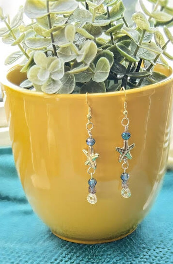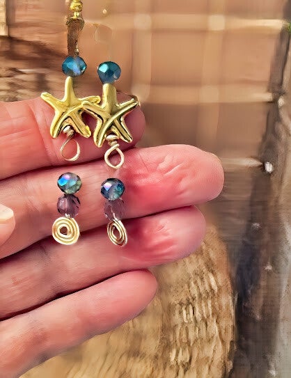 3.0" drop from the top of the 18 kt gold plated ear wire to the bottom of the gold colored swirl. Preciosa faceted blue and mauve czech crystals and a gold coloured sea star complete the design. Hypoallergenic