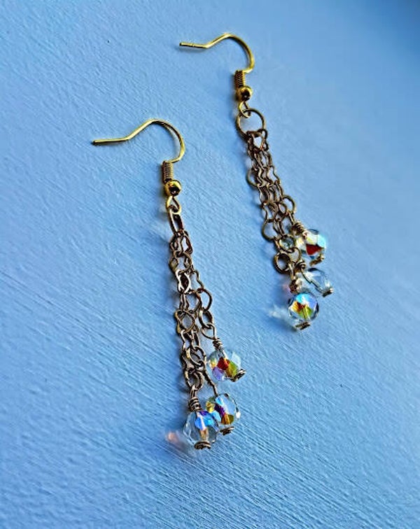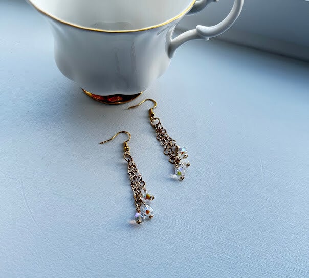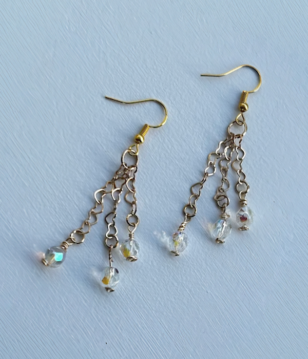 2.25" drop from the top of the 18 kt gold plated ear wire to the bottom of the longest dangle. Clear, faceted, preciosa czech crystals hang gracefully along the gold plated heart chain. Hypoallergenic