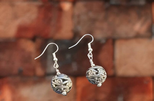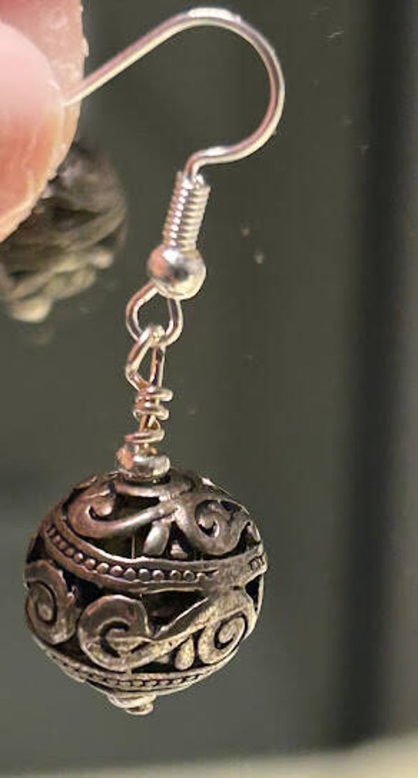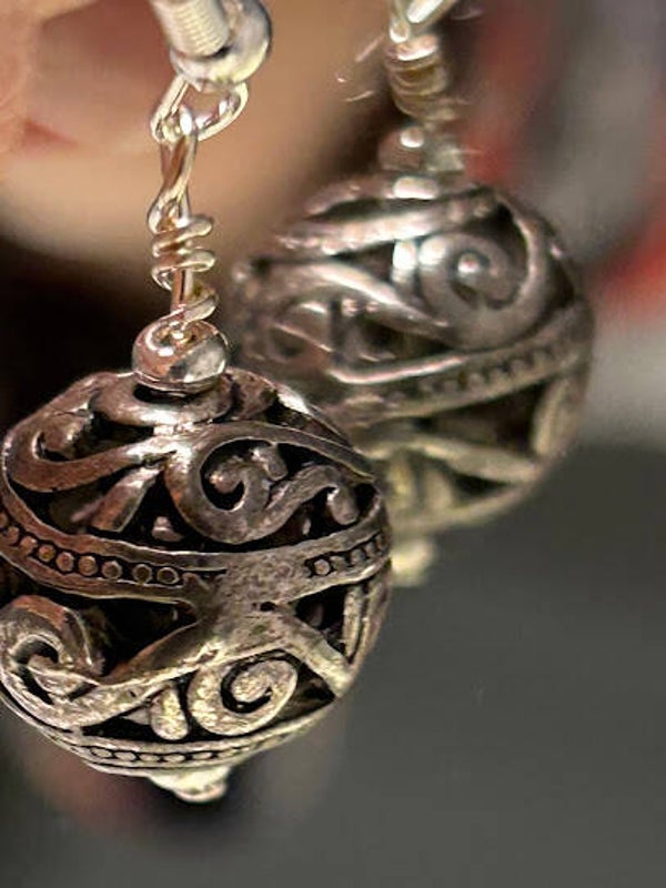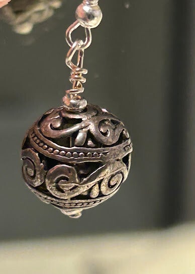 1.50" drop from the top of the silver ear wire to the bottom of the light, stainless steel, sphere, in a filigree design. Hypoallergenic