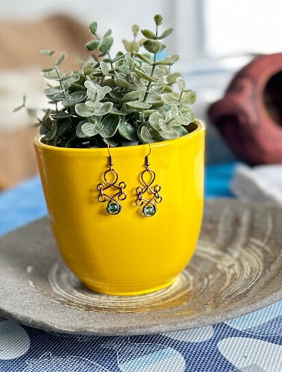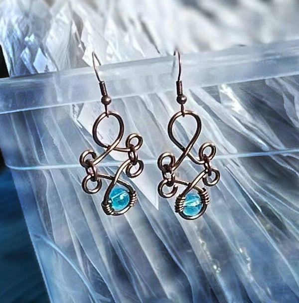 1.33" drop from the top of the enameled copper ear wire to the bottom bead. The Celtic, hand worked, pure copper frame is accented with a hand wrapped, round, turquoise glass bead. Hypoallergenic