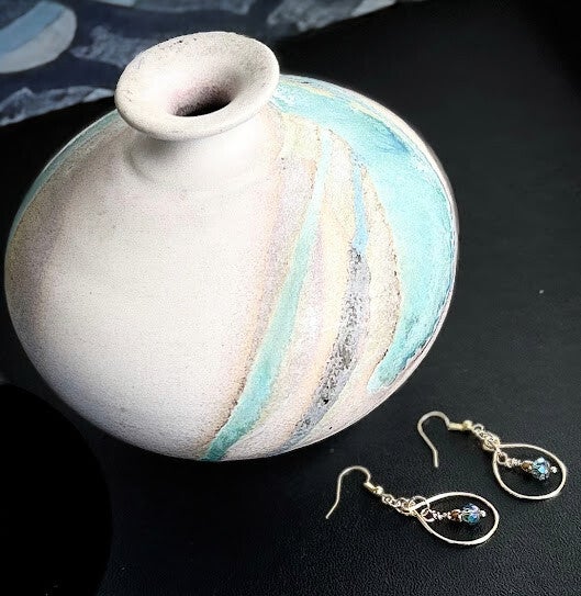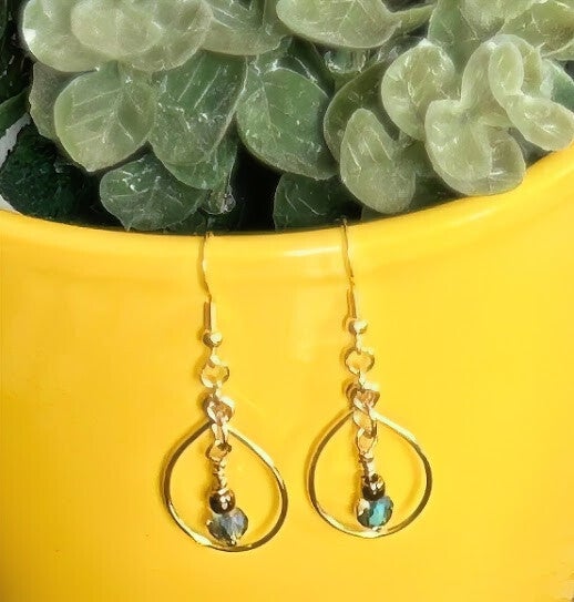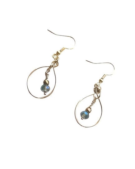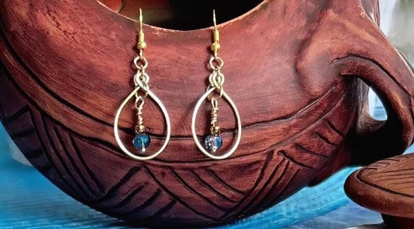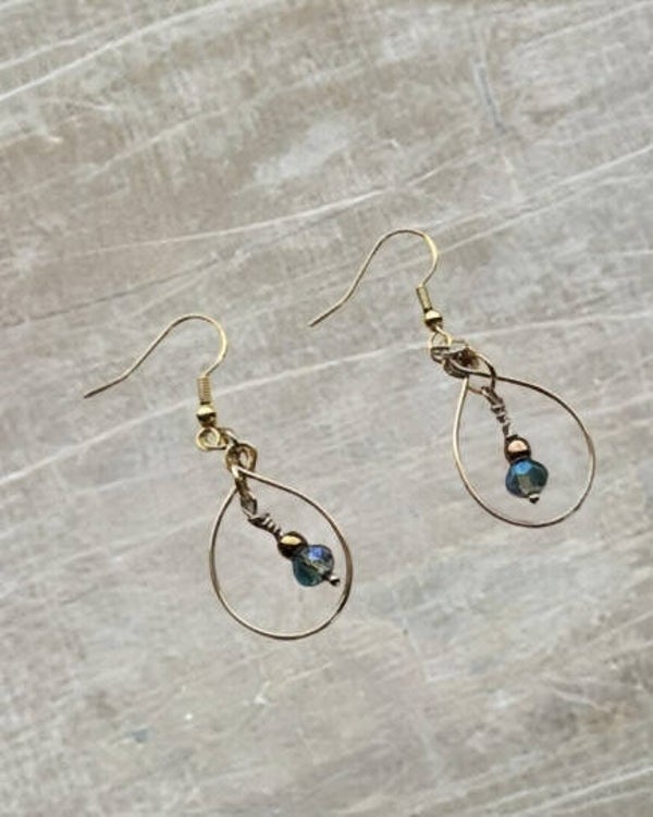 1.75" drop from the top of the 18 kt gold plated ear wire to the bottom of the gold plated wire oval. A central blue preciosa czech, faceted, crystal is accented by a copper colored bead. Hypoallergenic