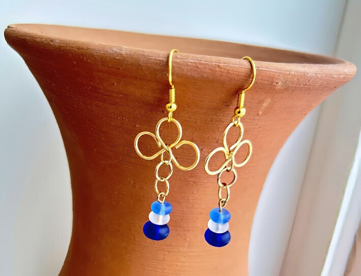 2.25" drop from the top of the 18 kt gold plated ear wire to the bottom of the dangle. The hand worked, ceramic coated copper wire frame, in a trefoil design, is accented by a sky blue, a clear, and a navy, glass bead. Hypoallergenic
