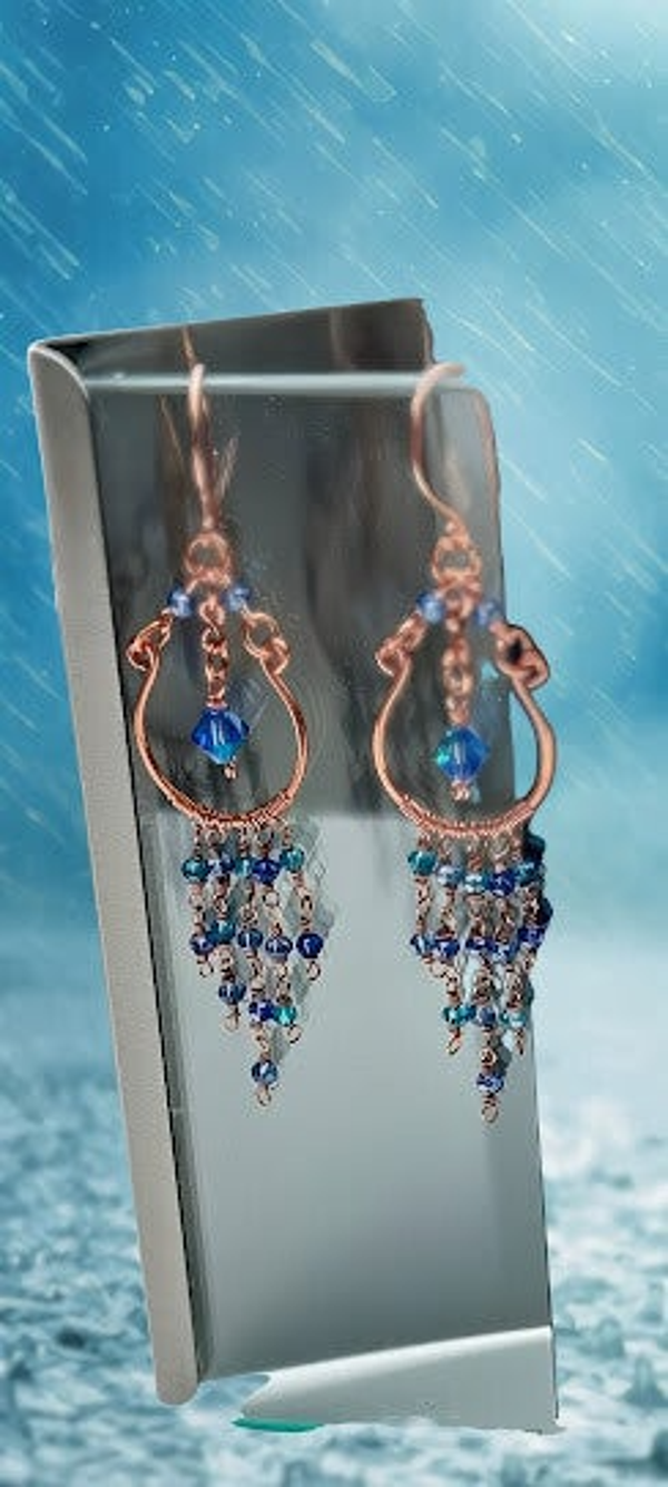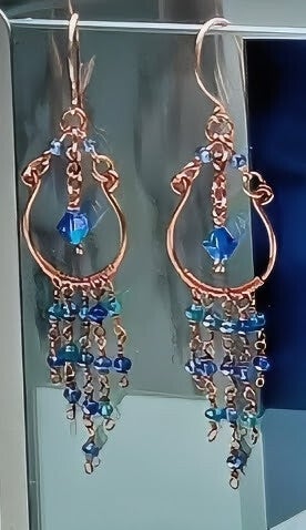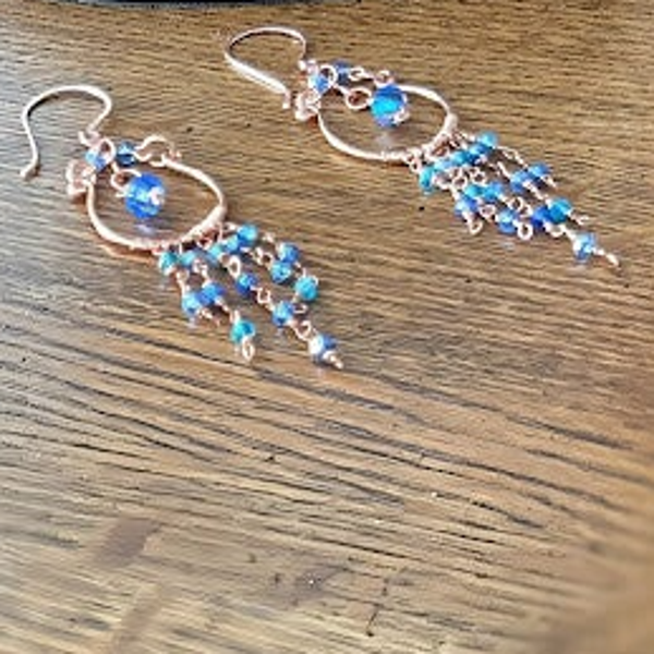 3.2" drop from the top of the enameled copper ear wire, to the bottom of the dangles. The chandelier hoop is hand worked, pure copper. Each dangle is accented with czech crystals, in turqouise and ocean blue tones, and hand wrapped using pure light copper. The central bead is a beautiful blue preciosa, czech faceted crystal. Hypoallergenic