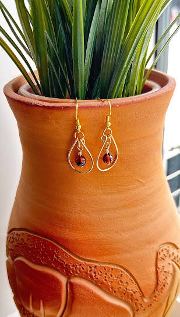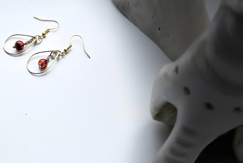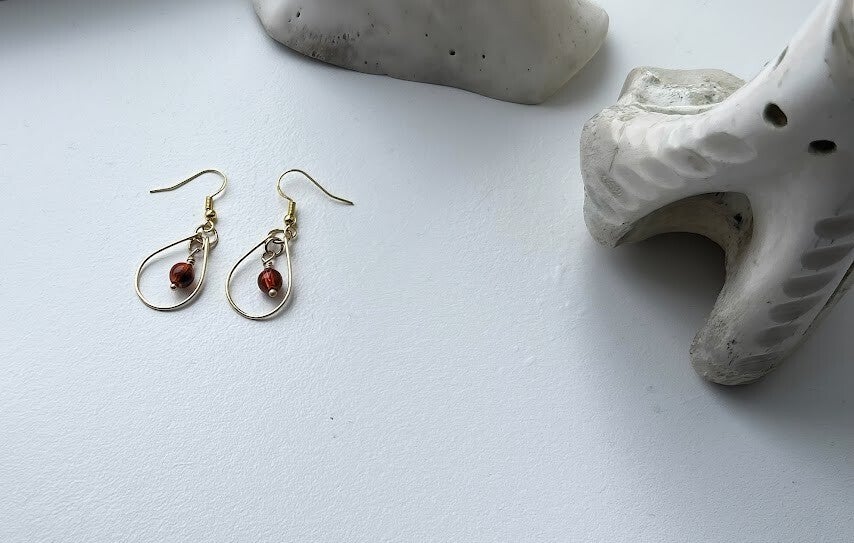 1.25" drop from the top of the 18 kt gold plated ear wire to the bottom of the copper, gold plated and handworked frame wire. The oval frame is accented by a single tiger eye glass bead. Hypoallergenic