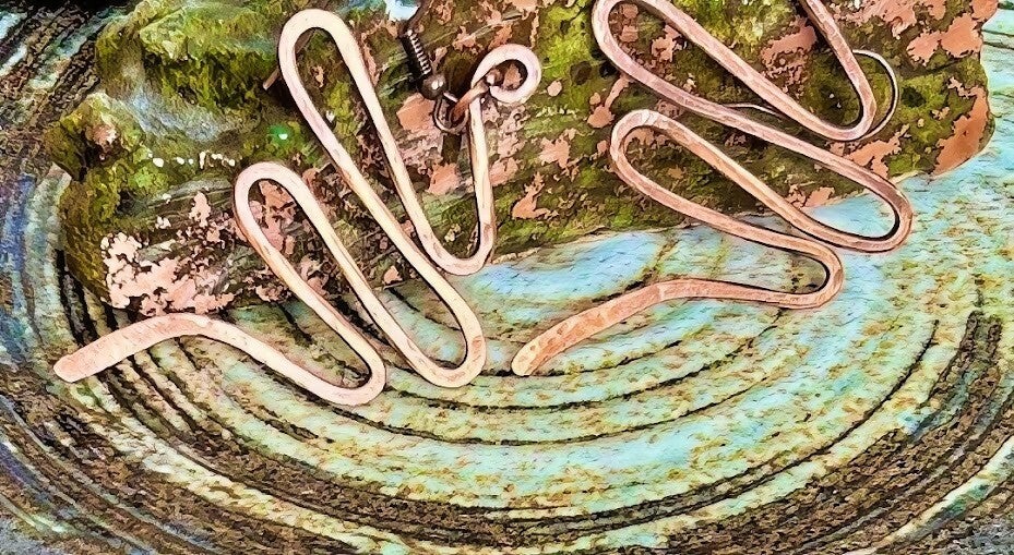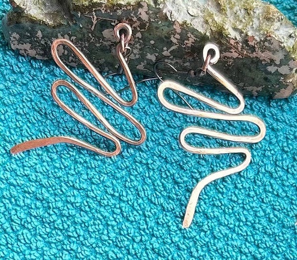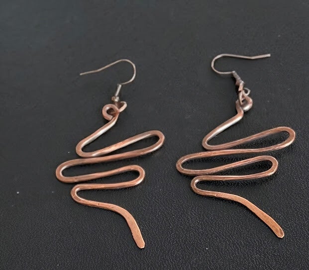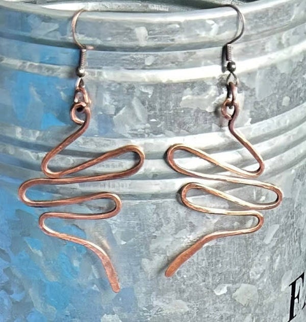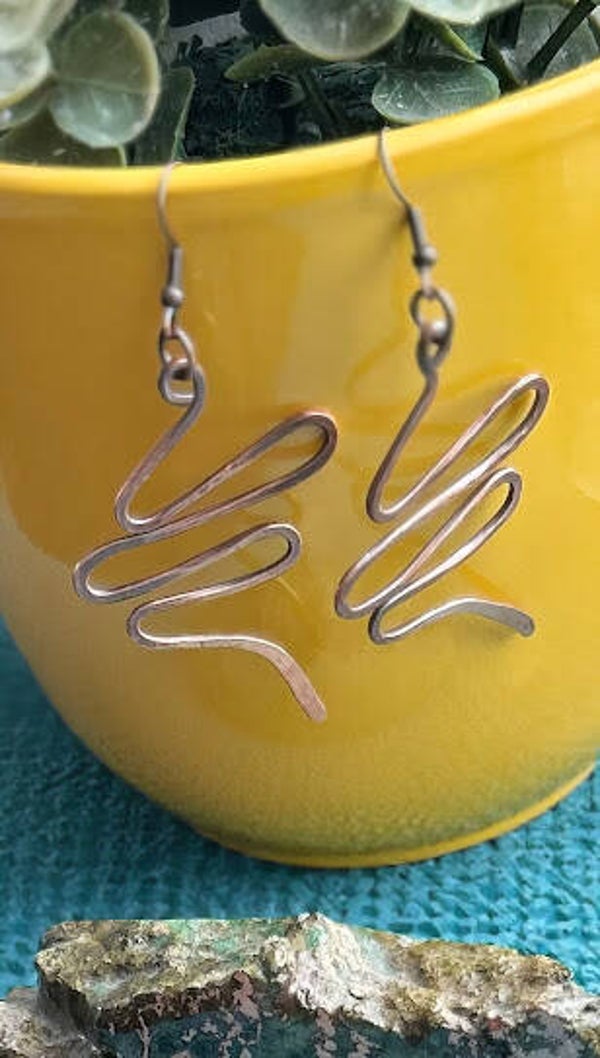 2.75" drop from the top of the enameled copper ear wire to the bottom of the hammered pure copper dangle. The dangle is 1.25" wide and is antiqued.