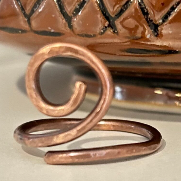 Size 11.5 pure copper thumb ring. The ring has been lightly antiqued. The swirl is 0.6" across.